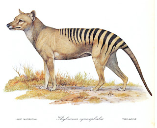 The thylacine, or commonly known as the tasmanian wolf or tasmanian tiger is believed to become extinct in the 20th century.